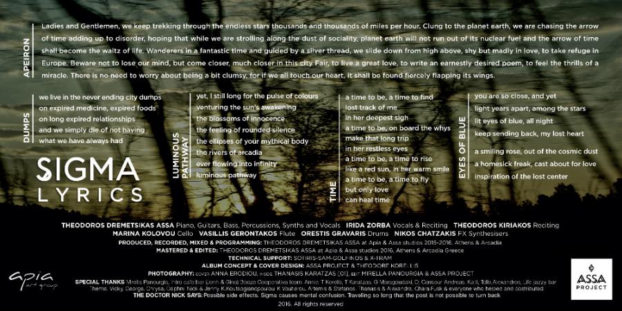 SIGMA the sound of loves of time rustling in the wind emerging eyes of lost orbits and echoes of drums from the love awakened hearts. Sigma a winding path of wandering souls a plain of distant galaxies where the rivers of arcadia ceaselessly flow into the oceans of light. Sigma a journey to the place that always lies ahead